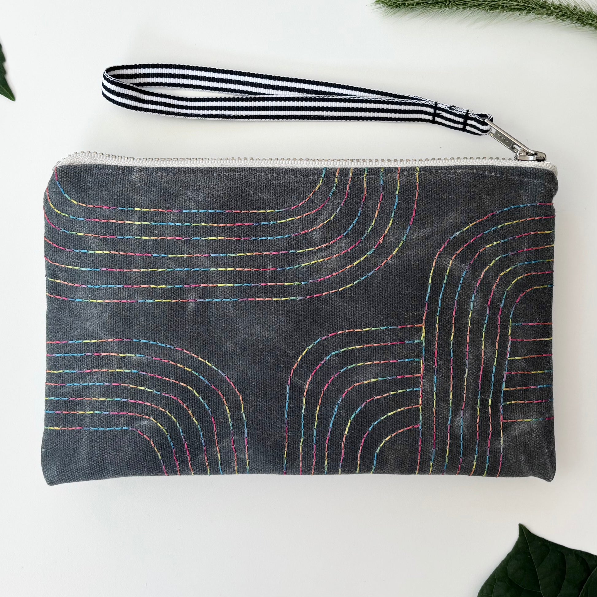A variation on our classic waxed canvas pouch. We’ve added a wrist loop so you can show it off! It’s just the right size to hold everything you need for an evening out or a day of shopping