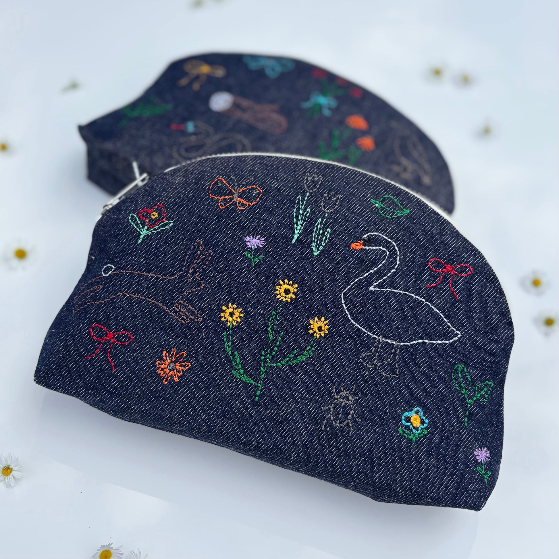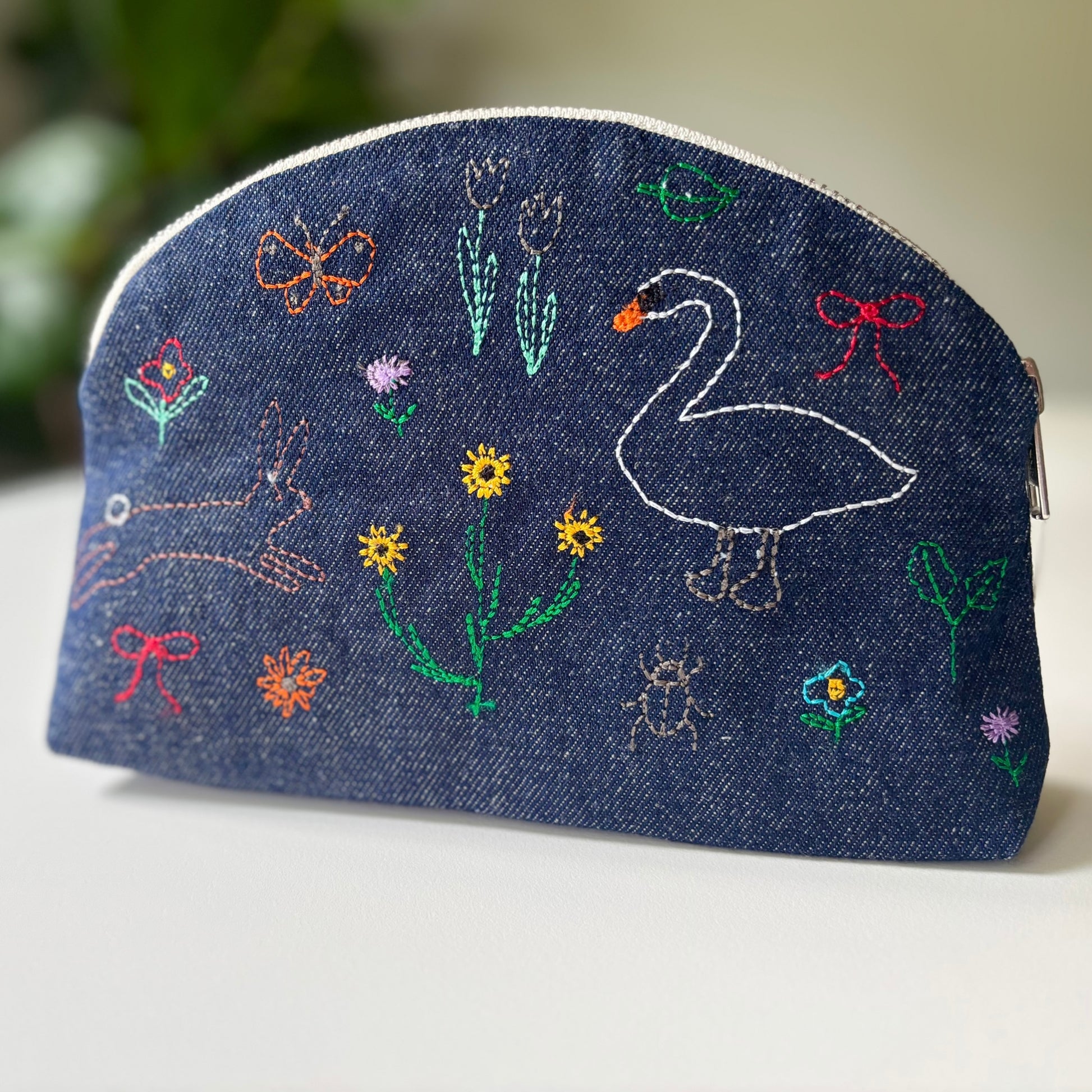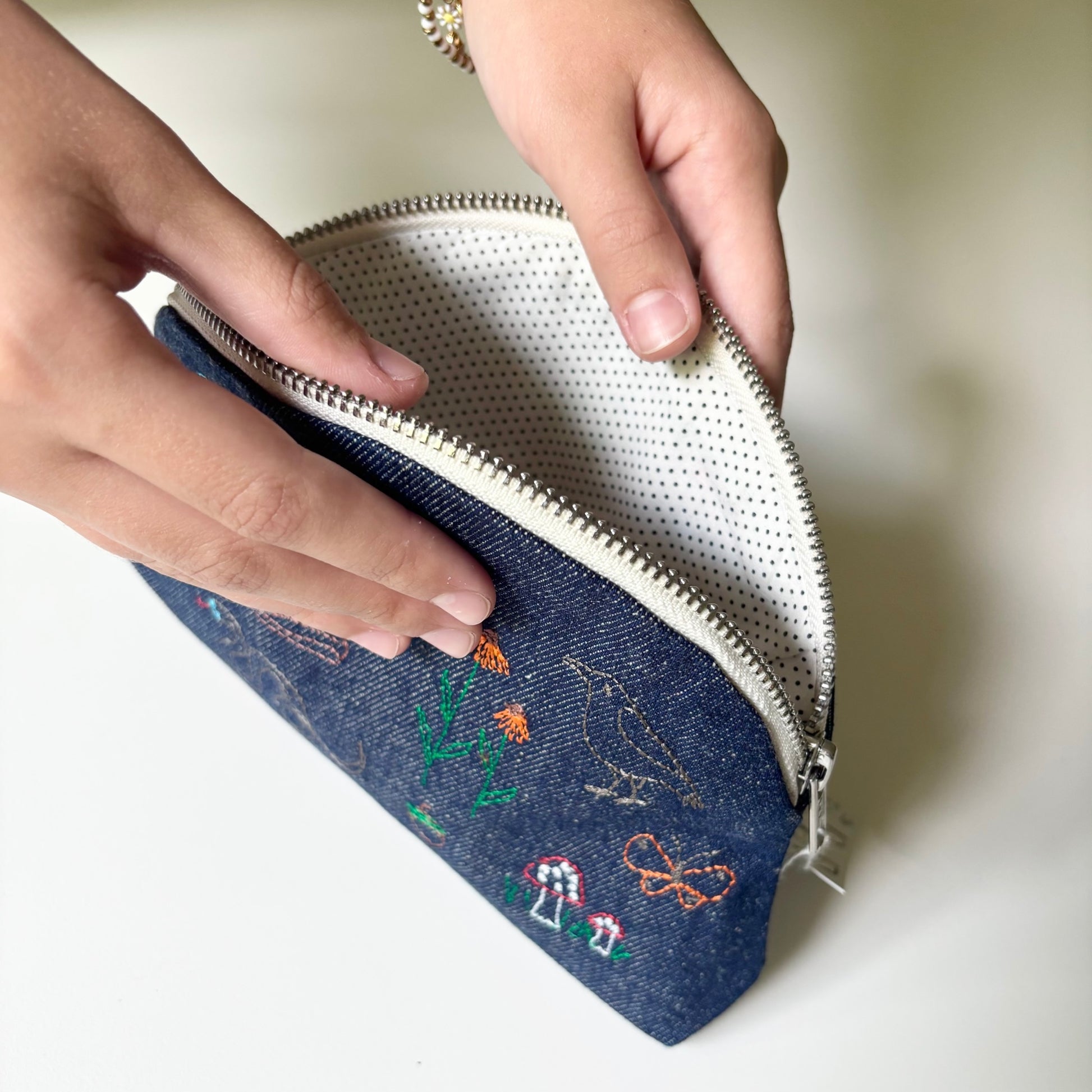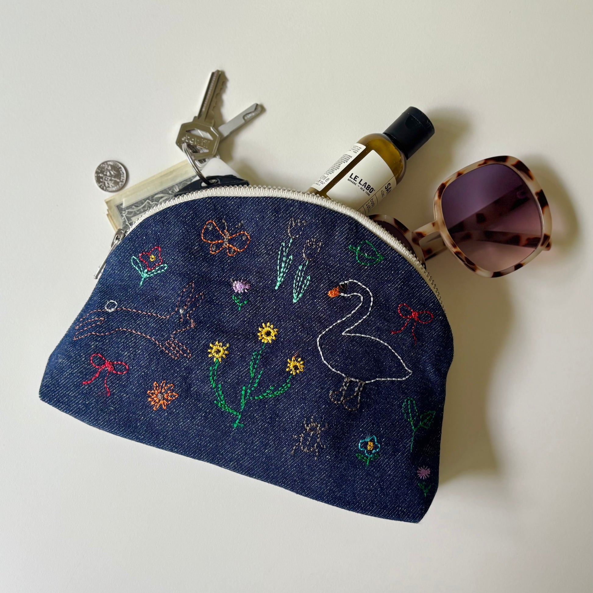 Birds, flowers and butterflies all embroidered onto this sweet denim zipper pouch. Use it for your sunglasses, your phone, your lipgloss, or all three!