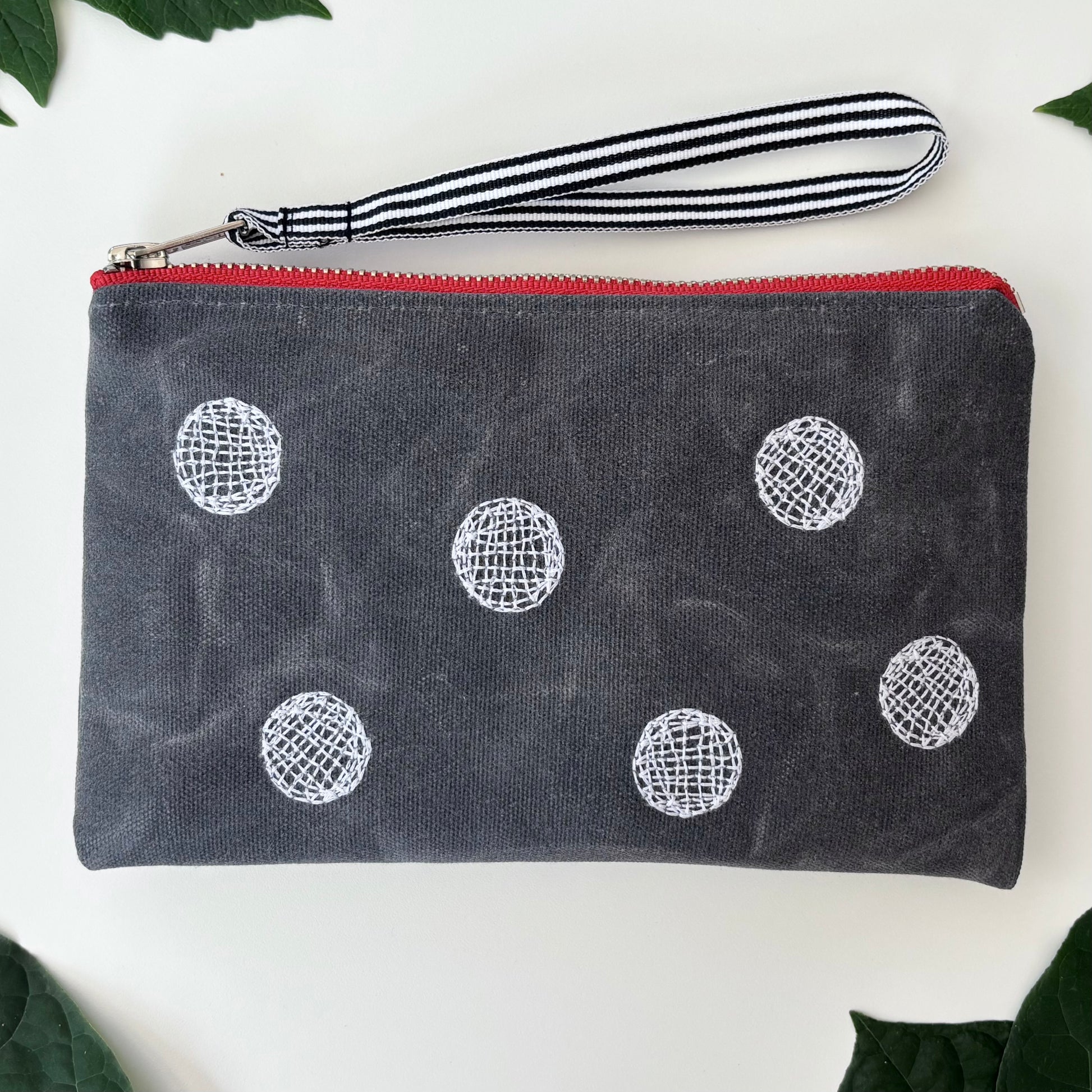 A variation on our classic waxed canvas pouch. We’ve added a wrist loop so you can show it off! It’s just the right size to hold everything you need for an evening out or a day of shopping