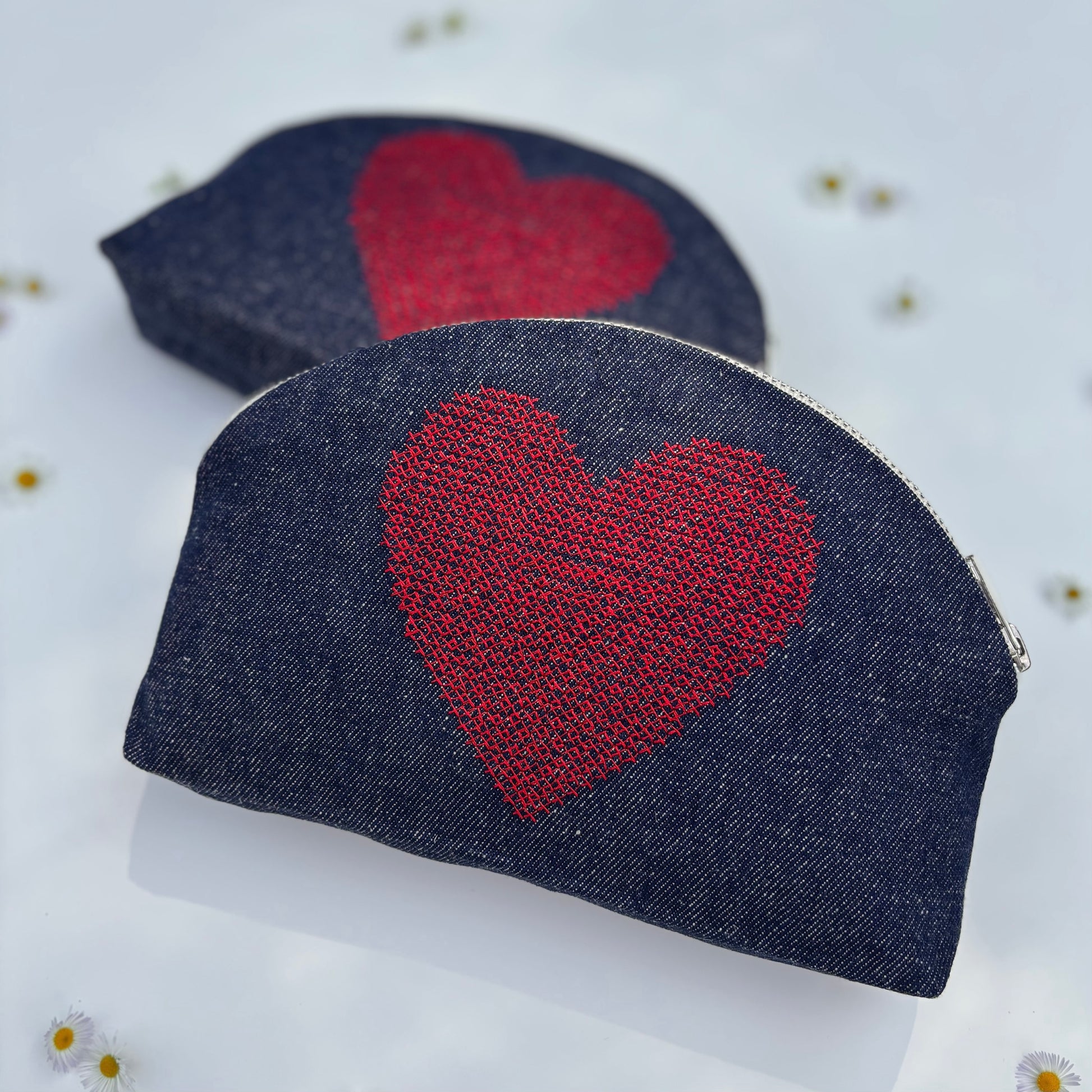Just a big heart cross stitched onto this sweet denim zipper pouch. Makes a great gift for someone you love!