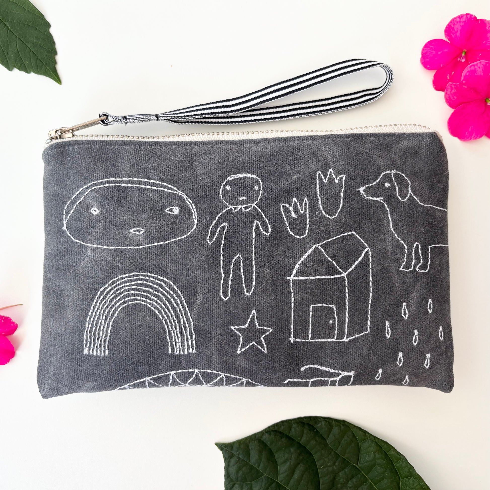 A variation on our classic waxed canvas pouch. We’ve added a wrist loop so you can show it off! It’s just the right size to hold everything you need for an evening out or a day of shopping