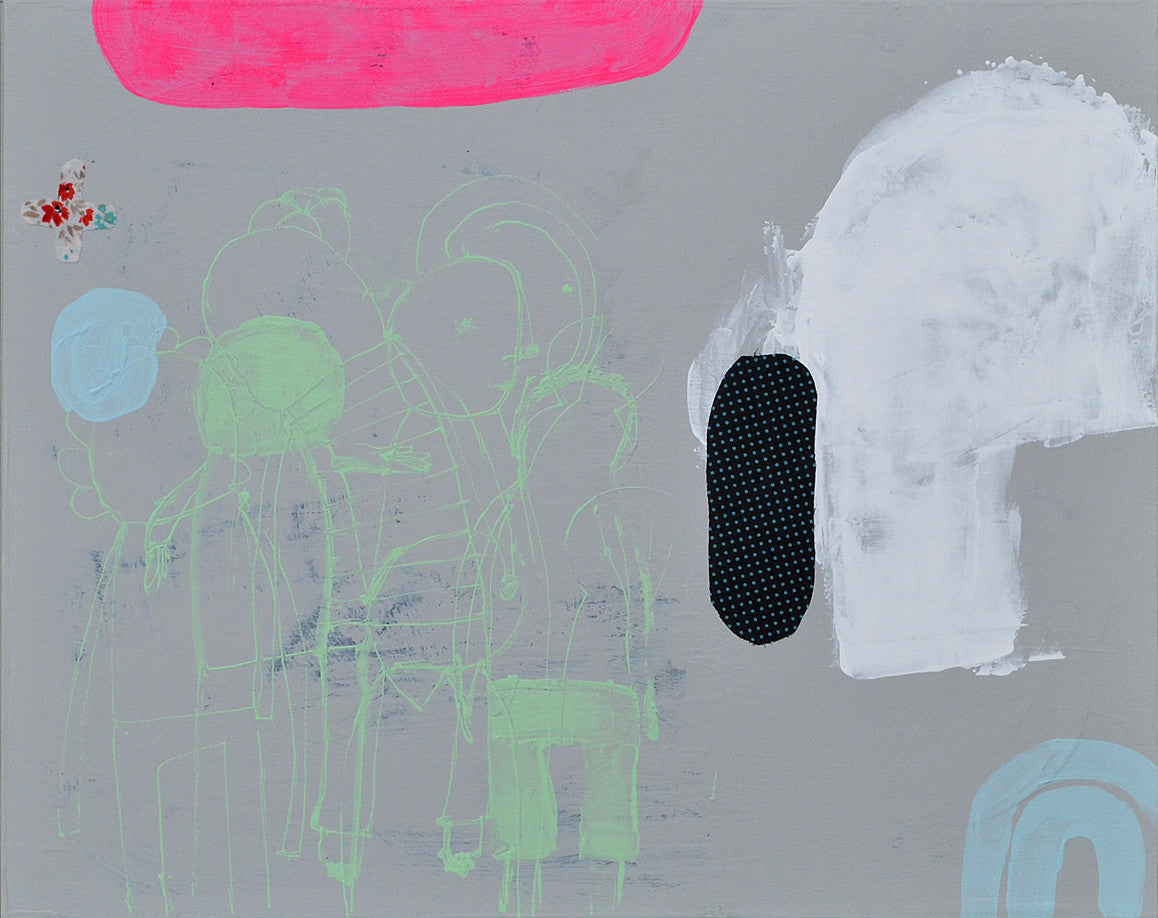 Acrylic, latex, and collage on 16"x 20"x 1" boxed panel.