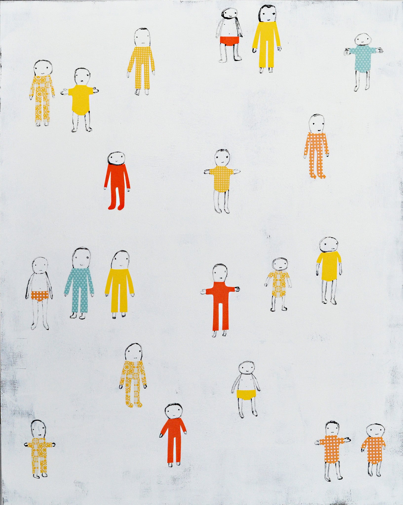 Acrylic, latex, and collage on 24"x 30"x 1" boxed panel.