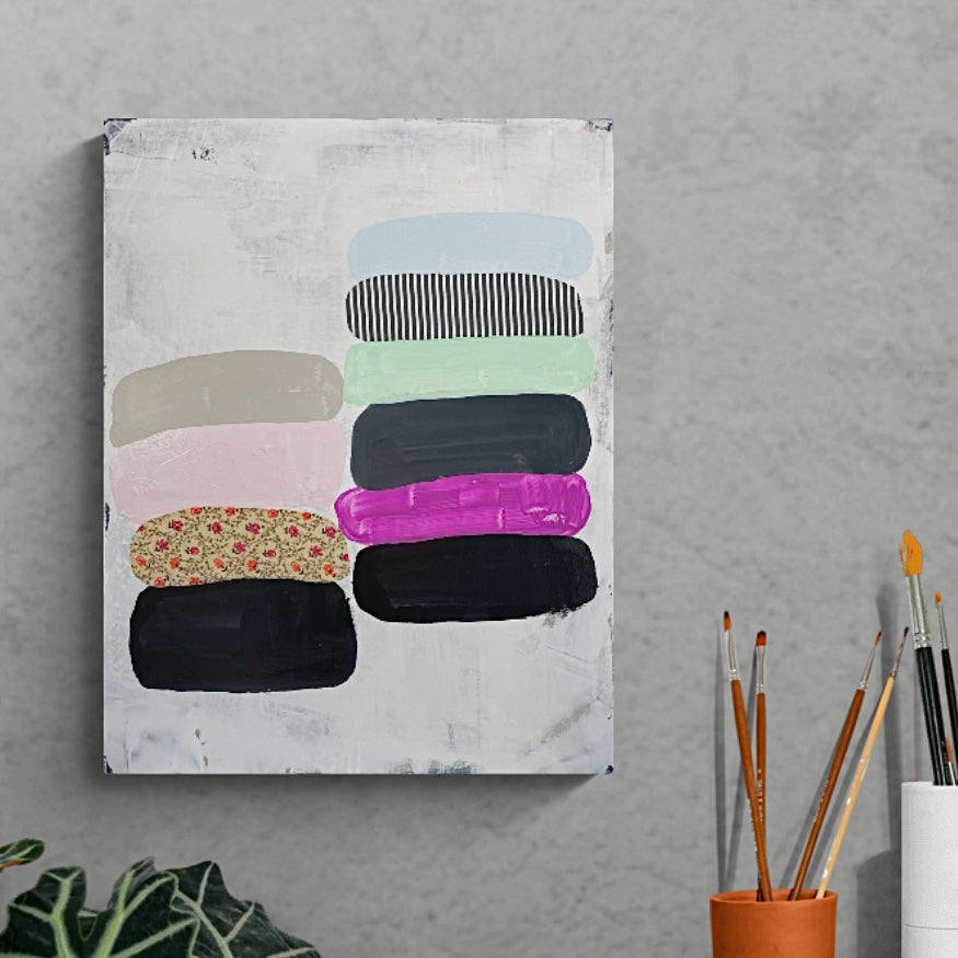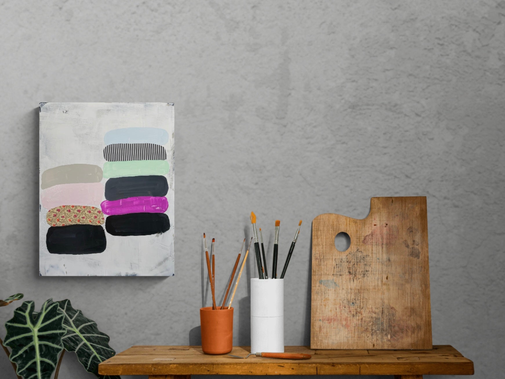 Acrylic, Latex, and Collage on 1.5” Cradled Panel