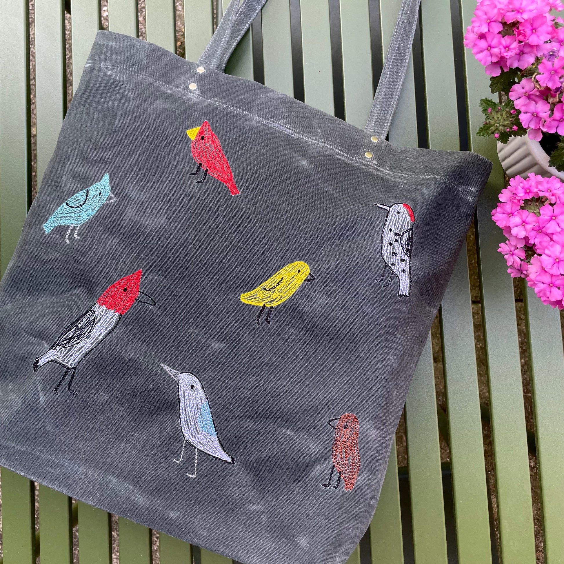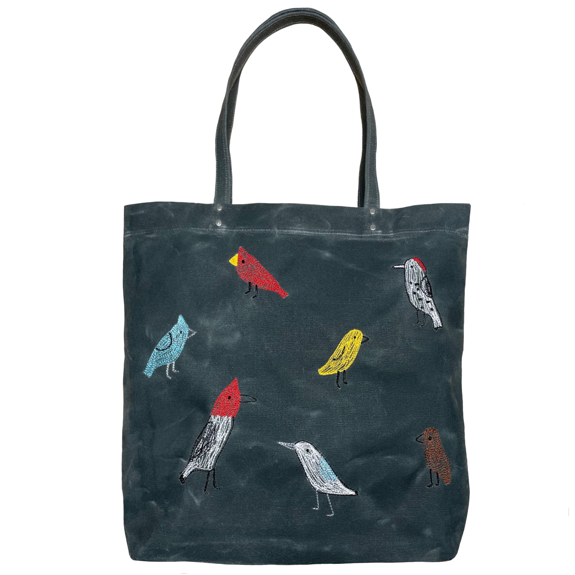 Waxed canvas tote with interior pocket and snap closure.Body measures 15"high x 16"wide, handles have 9" drop.