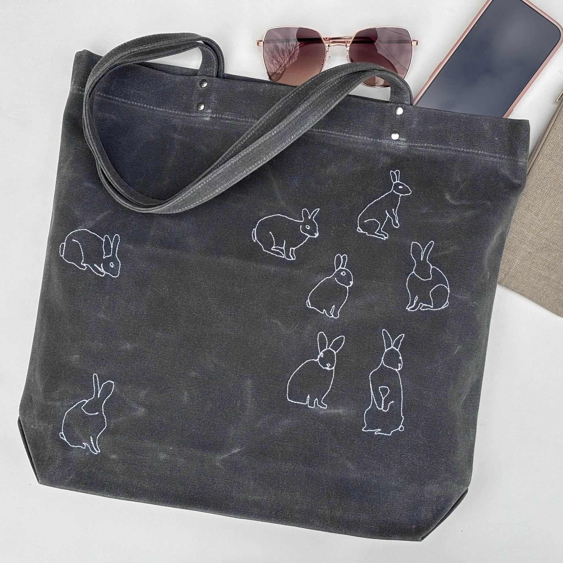 Waxed canvas tote with interior pocket and magnetic closure.Body measures 15"high x 16"wide, handles have 9” drop.